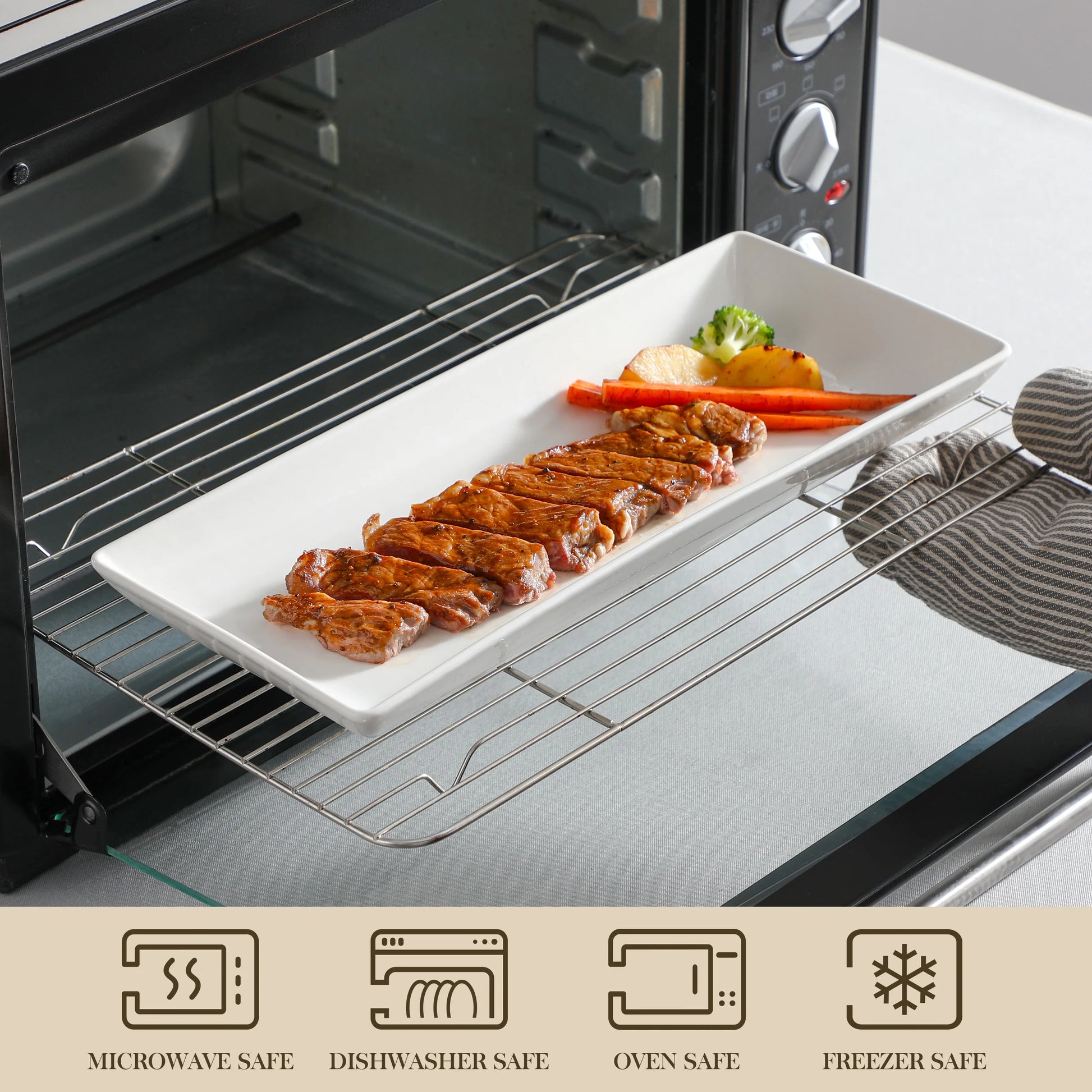 This glossy white 3-tier server blends modern design with practical versatility, available in 12-inch and 14-inch sizes to suit any occasion. The sturdy cast iron stand holds three rectangular porcelain plates, featuring a smooth, glossy white finish and gently tilted rims to prevent spills. Perfect for serving appetizers, fresh fruit, pastries, and more, it adds a refined touch to buffet tables and kitchen counters. The porcelain plates are microwave, oven, and dishwasher safe, while the stand should be wiped clean. Also great as a stylish organizer for jewelry and office essentials.