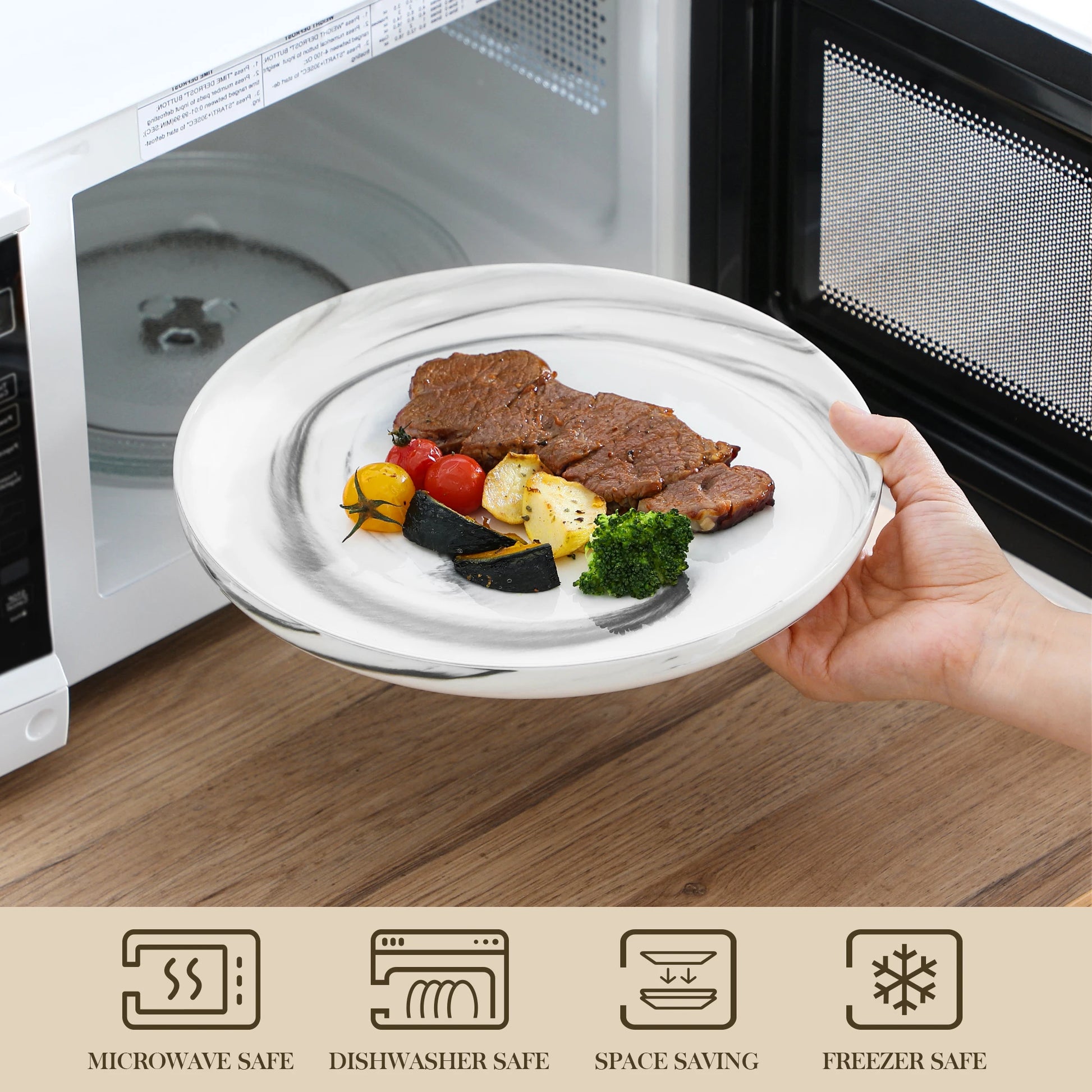 Crafted from premium gourmet porcelain, the Malacasa 24-Piece Set offers scratch resistance and lasting durability, perfect for home dining or the hospitality industry. Designed for six, it includes dinner plates, salad plates, soup bowls, and cereal bowls, available in classic off-white or off-white with black trim. Featuring a timeless round design and a stackable, space-saving structure, it’s microwave, oven, and dishwasher safe. Durable and elegant, the Amelia set seamlessly complements modern table settings for everyday meals or special occasions.